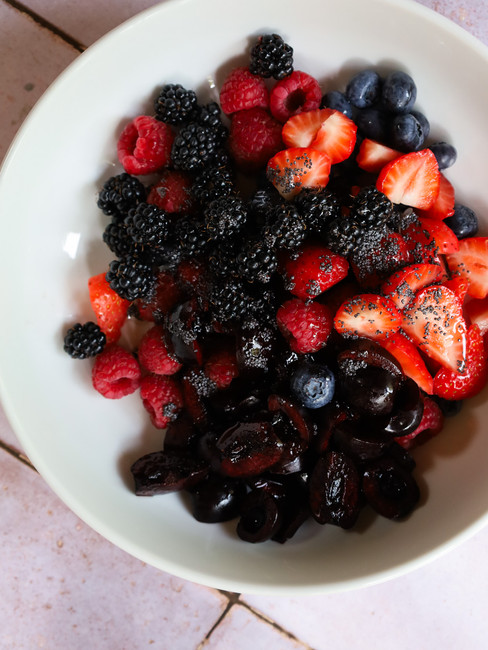 Berry Season is my favourite in the UK. Local cherries, Strawberries, Blueberries, Blackberries, Raspberries... they are at their best at the moment and super sweet. I used a combination of all the above, but feel free to use your favourites.