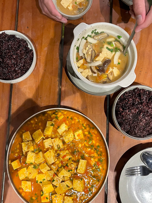 We started our trip with a 3-day tour on the Ha Giang Loop. Included in the tour was accommodation and 3 meals a day. Although not many vegan options were available there was at least always a good portion of tofu in tomato broth, sautéed greens, delicious stead rice and more often then not vegetable spring rolls.